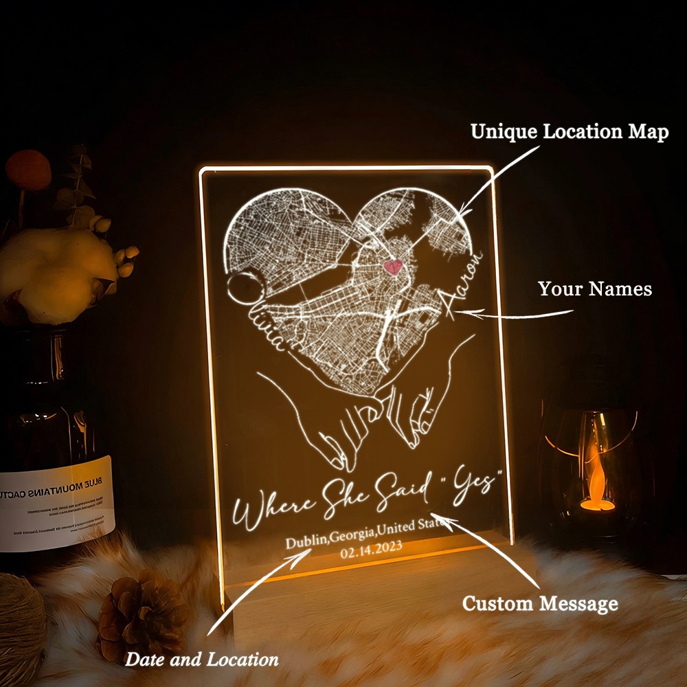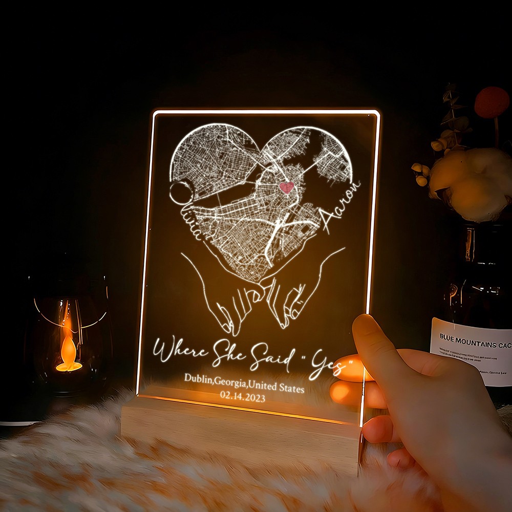 Custom Where She Said Yes Acrylic Map Night Light for Couple