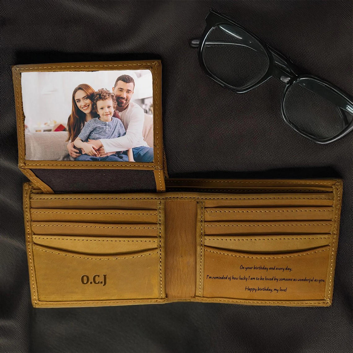 What makes it unique? Fully customizable touches! Add his initials, a meaningful date, custom engraving, or upload a favorite photo to be embroidered on the cover. The handcrafted embroidered photo adds texture and sentiment, turning the wallet into a cherished keepsake.