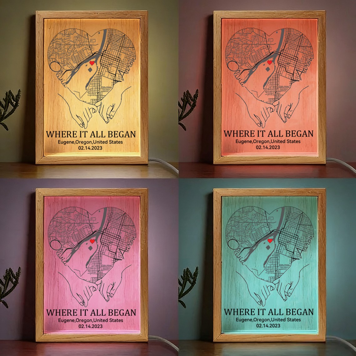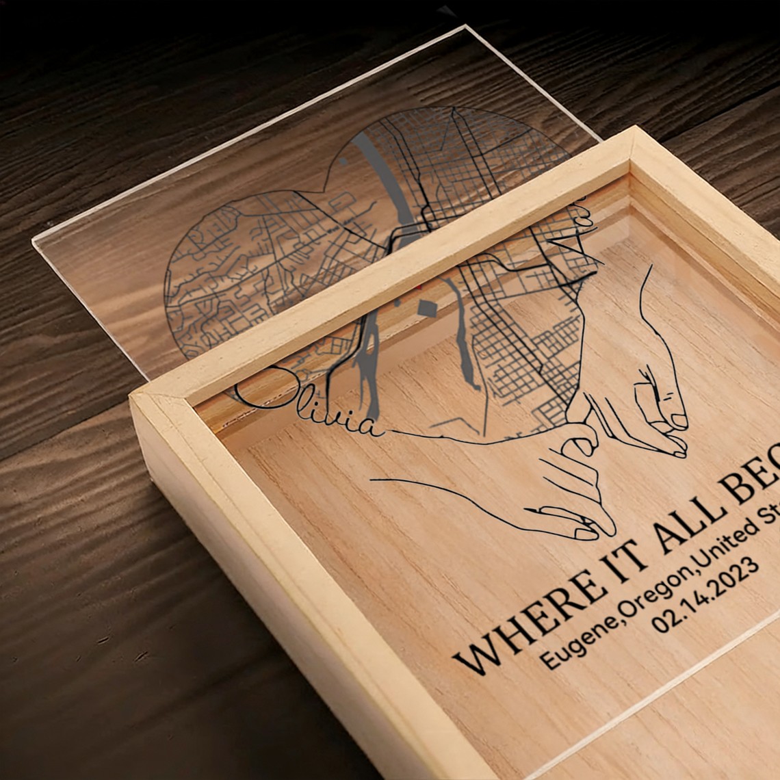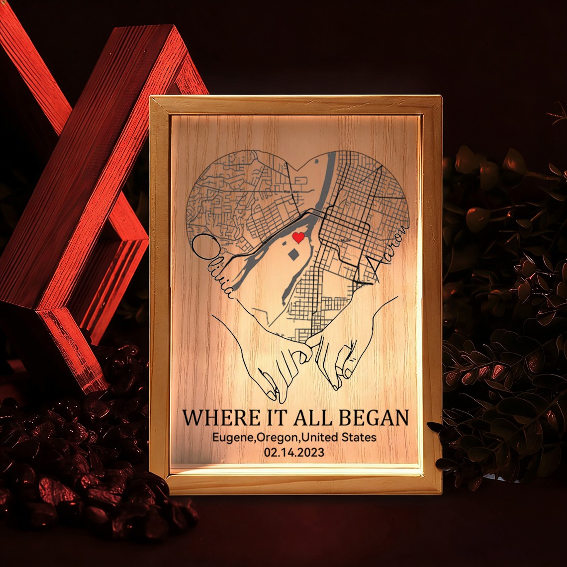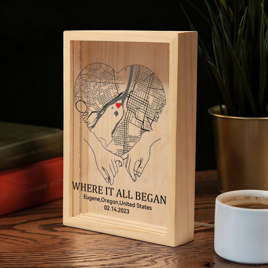The Personalized Where It All Began Map Light Box for Couple turns a meaningful location into a warm and eye catching display. Featuring a custom map design that highlights the place your story began, this light box transforms a special memory into a timeless piece of home décor. Made with a clear acrylic panel and a natural wood base, it adds a modern and elegant touch to bedrooms, desks, and living spaces. The print appears on one side with a soft mirrored reflection on the back, creating a clean and layered visual effect.
