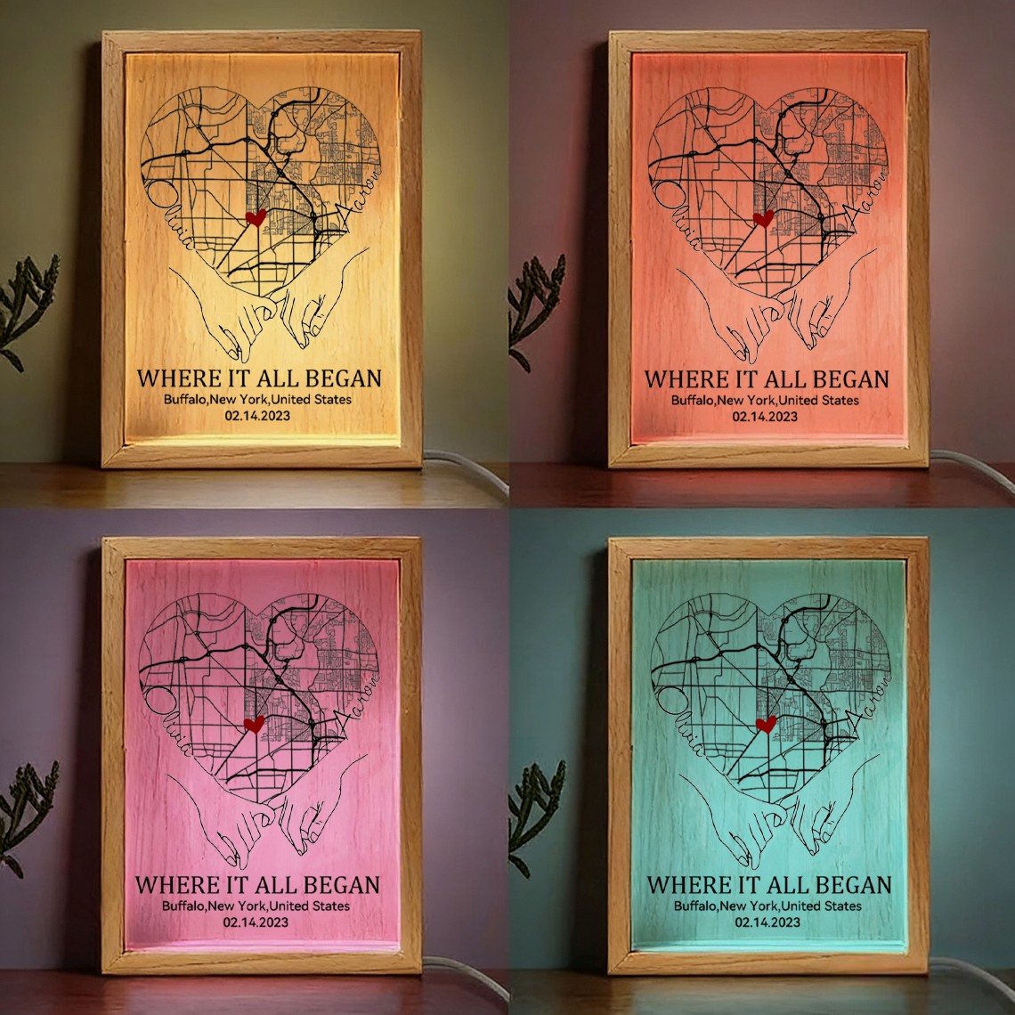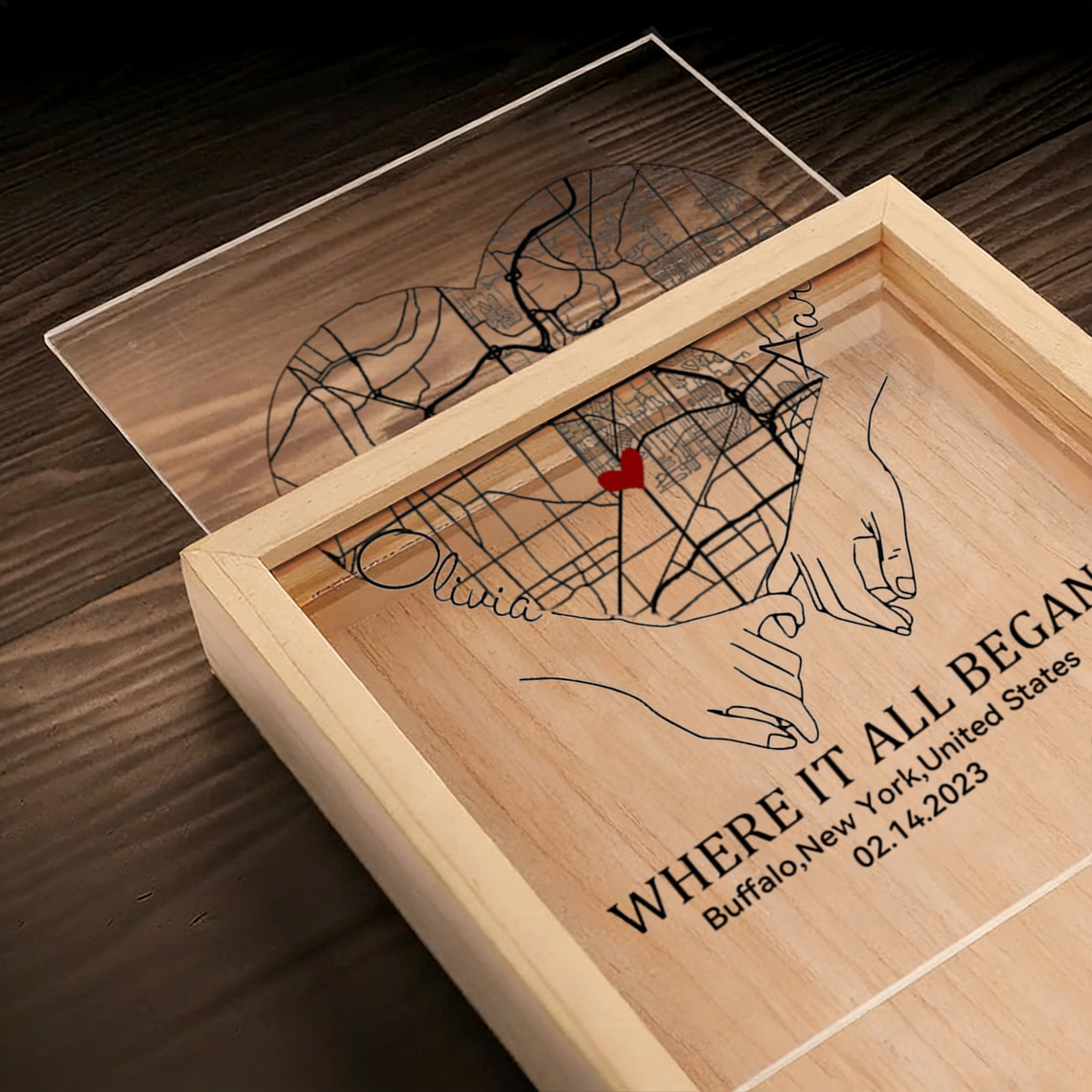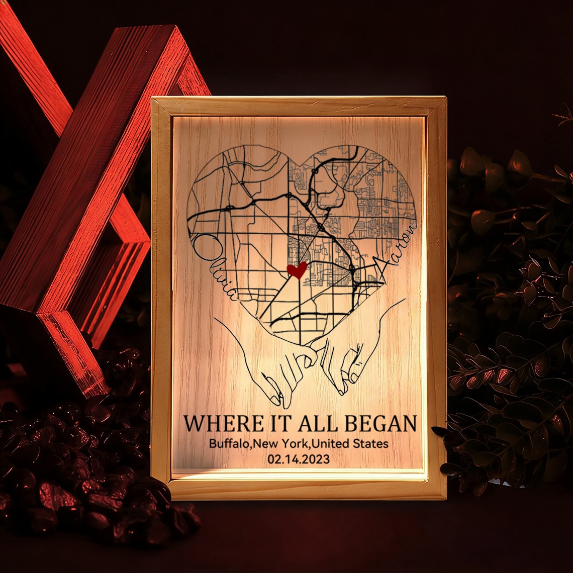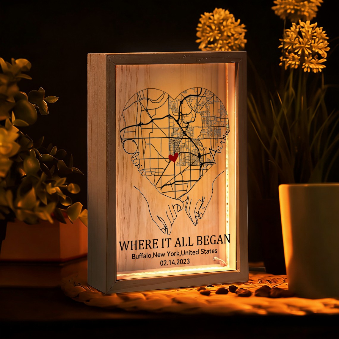 The Personalized Where It All Began Map Light Box for Couple turns a meaningful location into a warm and eye catching display. Featuring a custom map design that highlights the place your story began, this light box transforms a special memory into a timeless piece of home décor. Made with a clear acrylic panel and a natural wood base, it adds a modern and elegant touch to bedrooms, desks, and living spaces. The print appears on one side with a soft mirrored reflection on the back, creating a clean and layered visual effect.