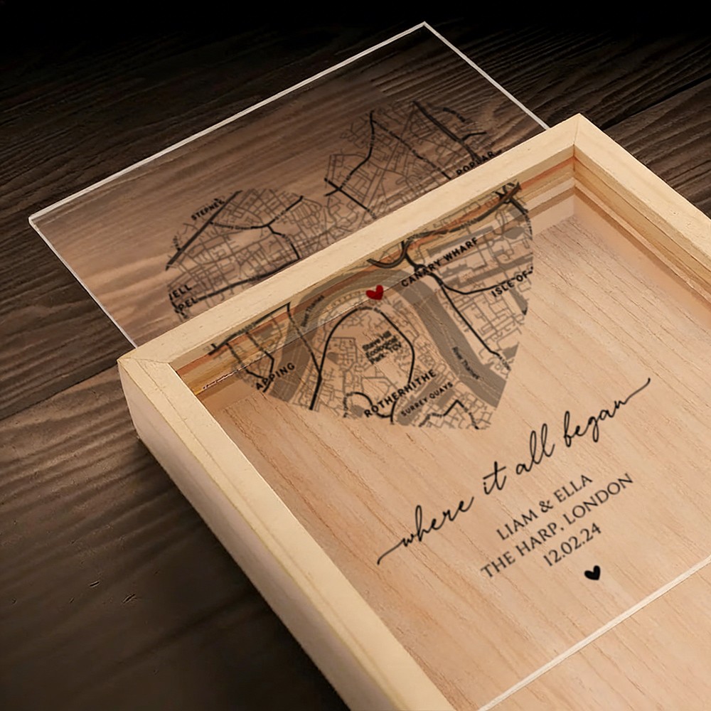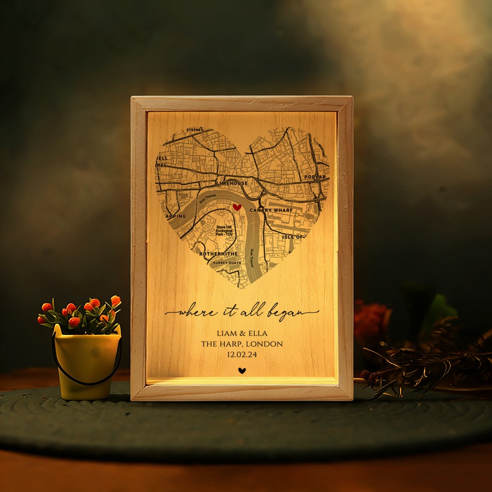 The Personalized Where It All Began Map Light Box for Couple turns a meaningful location into a warm and eye catching display. Featuring a custom map design that highlights the place your story began, this light box transforms a special memory into a timeless piece of home décor. Made with a clear acrylic panel and a natural wood base, it adds a modern and elegant touch to bedrooms, desks, and living spaces. The print appears on one side with a soft mirrored reflection on the back, creating a clean and layered visual effect.