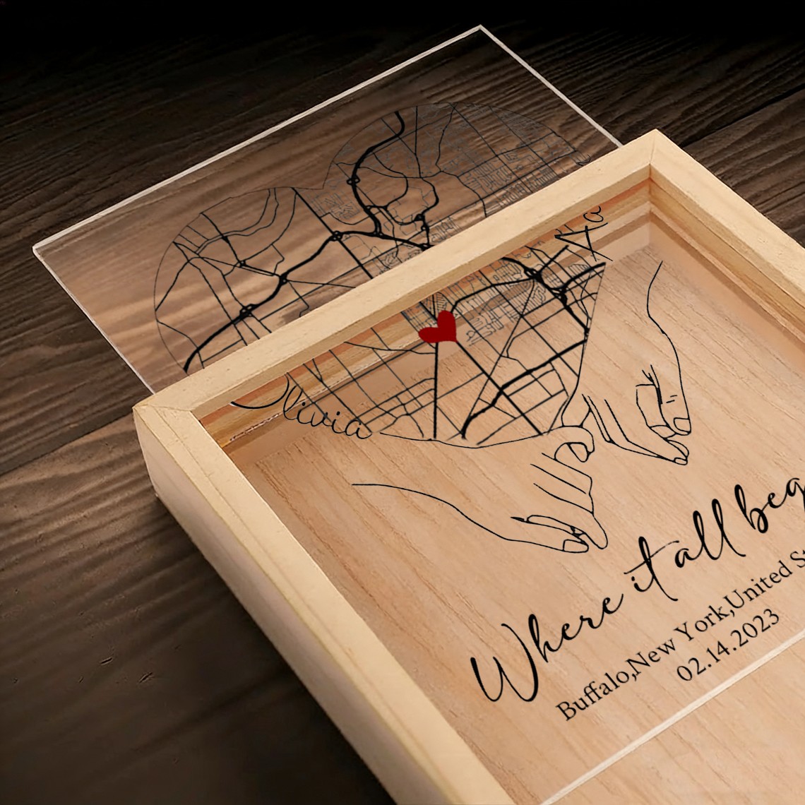 The Personalized Where It All Began Map Light Box for Couple turns a meaningful location into a warm and eye catching display. Featuring a custom map design that highlights the place your story began, this light box transforms a special memory into a timeless piece of home décor. Made with a clear acrylic panel and a natural wood base, it adds a modern and elegant touch to bedrooms, desks, and living spaces. The print appears on one side with a soft mirrored reflection on the back, creating a clean and layered visual effect.