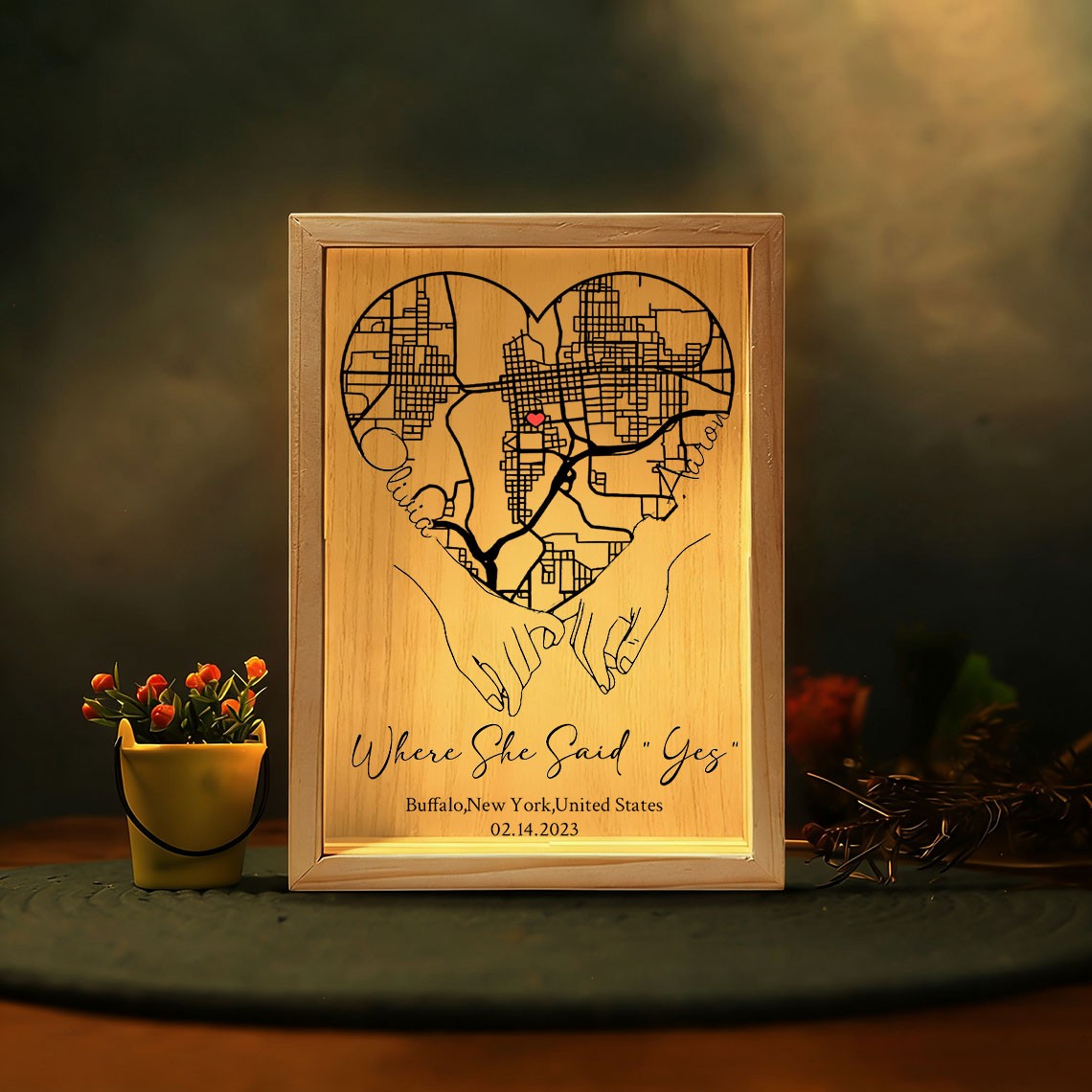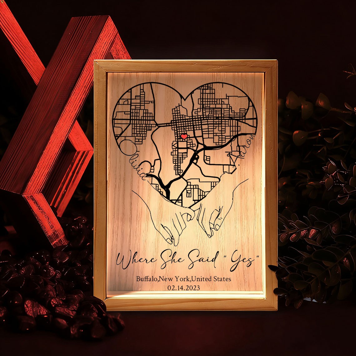 Personalized Where She Said Yes Map Light Box for Couple turns a meaningful location into a warm and eye catching display. Featuring a custom map design that highlights the place your story began, this light box transforms a special memory into a timeless piece of home décor. Made with a clear acrylic panel and a natural wood base, it adds a modern and elegant touch to bedrooms, desks, and living spaces. The print appears on one side with a soft mirrored reflection on the back, creating a clean and layered visual effect.