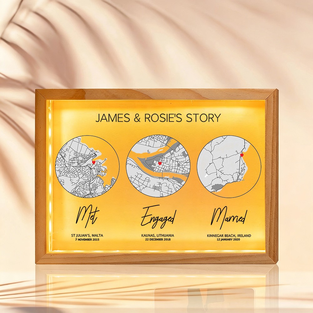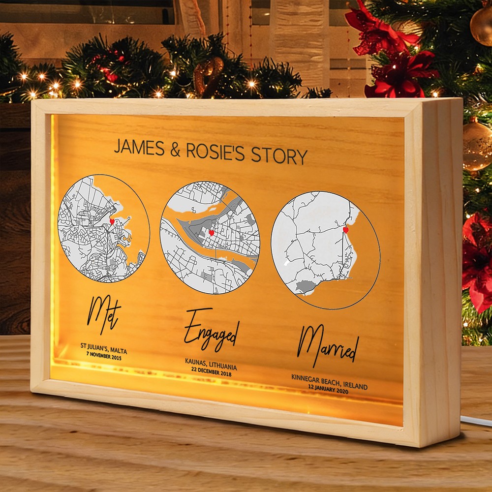 The Personalized Love Story Map Wooden Light Box for Couple transforms your most important moments into a warm and meaningful display. Designed to showcase one to three custom map locations, it visually tells the story of your journey together — from where you first met to the milestones that followed.