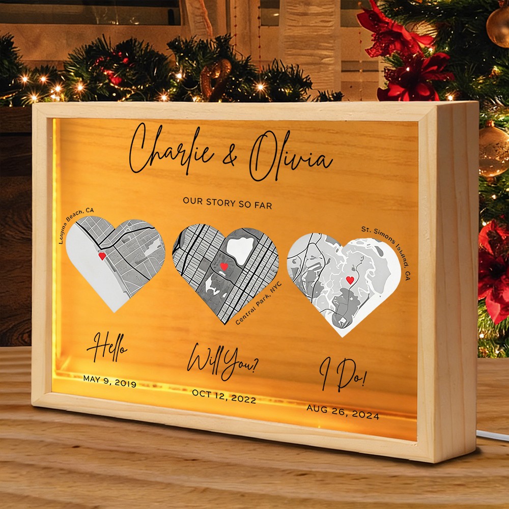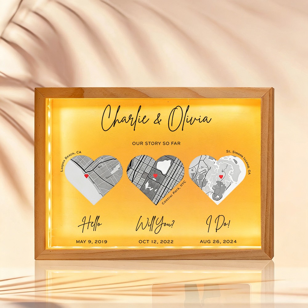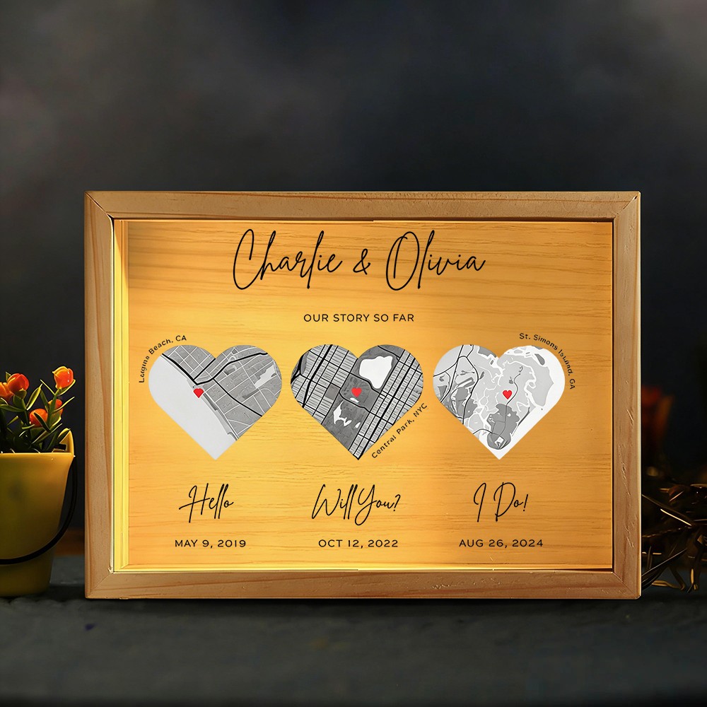 The Personalized Love Story Map Wooden Light Box for Couple transforms your most important moments into a warm and meaningful display. Designed to showcase one to three custom map locations, it visually tells the story of your journey together — from where you first met to the milestones that followed.